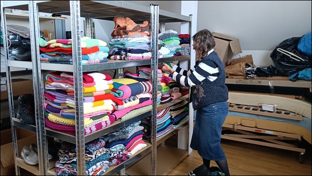 De meegebrachte hulpgoederen werden gesorteerd en in de opslag opgeslagen. De komende tijd zal het materiaal terechtkomen op plaatsen waar dit het meest nodig is.