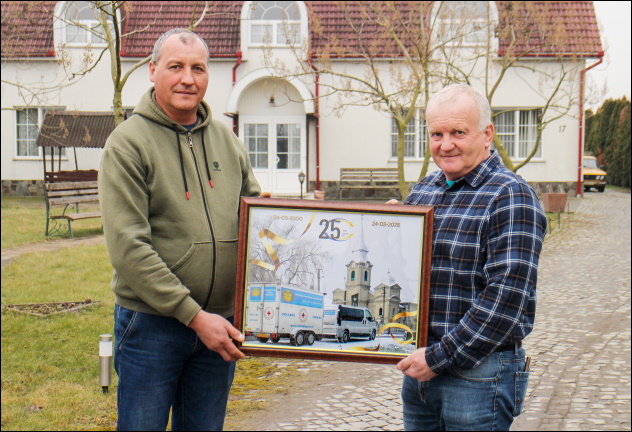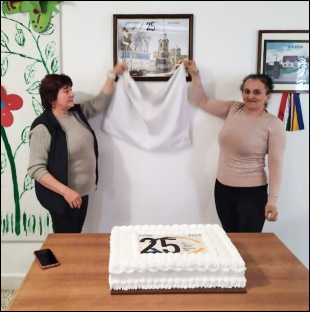 Op de foto de leiding van Stichting OZO in Oekraïne: Algemeen directeur Jenö Hidi en János Bálog die de leiding heeft over de boerderij voor Rehoboth. Zij krijgen een fotocollage overhandigd over de afgelopen 25 jaar. De foto zal een plaatsje in Rehoboth krijgen. Deze foto werd maandagochtend onthuld door enkele verzorgsters van Rehoboth. De bewoners van Rehoboth werden verrast met een taart en voor het personeel was er een presentje.