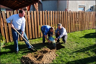 Op de eerste dag van ons werkbezoek was er in het centrum van Nagydobrony een officiële bijeenkomst. Rondom een kort geleden geplaatst beeld werden door verschillende leden en instanties uit de Hongaarse gemeenschap bomen geplaatst. Veel mensen waren voor deze plechtigheid naar het stukje groen gekomen om hiervan getuige te zijn.