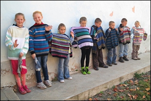 Bij een ander schooltje in het dorp leverden we een schoolbord en een aantal gebreide truien af. Die door de kinderen direct werden gepast. Natuurlijk poseerden ze graag voor een foto.