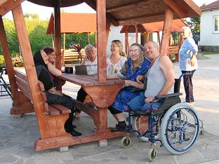 De zon schijnt, het is prachtig weer en dat is buiten ook te zien. De bewoners genieten in de schaduw buiten van het mooie weer. De dames breien wat, Laci is bezig met de verzorging van de kippen.