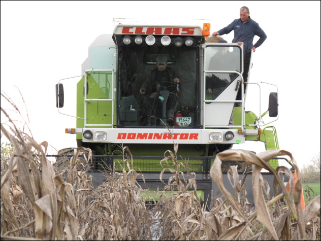 In de middag werd een bezoek gebracht aan een perceel mais. Dit is dit jaar het eerste perceel wat gedorst wordt met de vorig jaar aangeschafte combine. Het was nog niet zeker of het dorsen door kon gaan omdat er afgelopen nacht een flinke onweersbui met hagel en veel regen was langsgekomen. Maar ondanks de modder slaagde de combine er toch in om de maiskorrels te oogsten. Men ging uit van drie ton van een hectare maar het viel enigszins mee, het werd ongeveer vier ton. Vanwege de droogte van afgelopen zomer blijft de opbrengst wel achter bij vorige jaren.