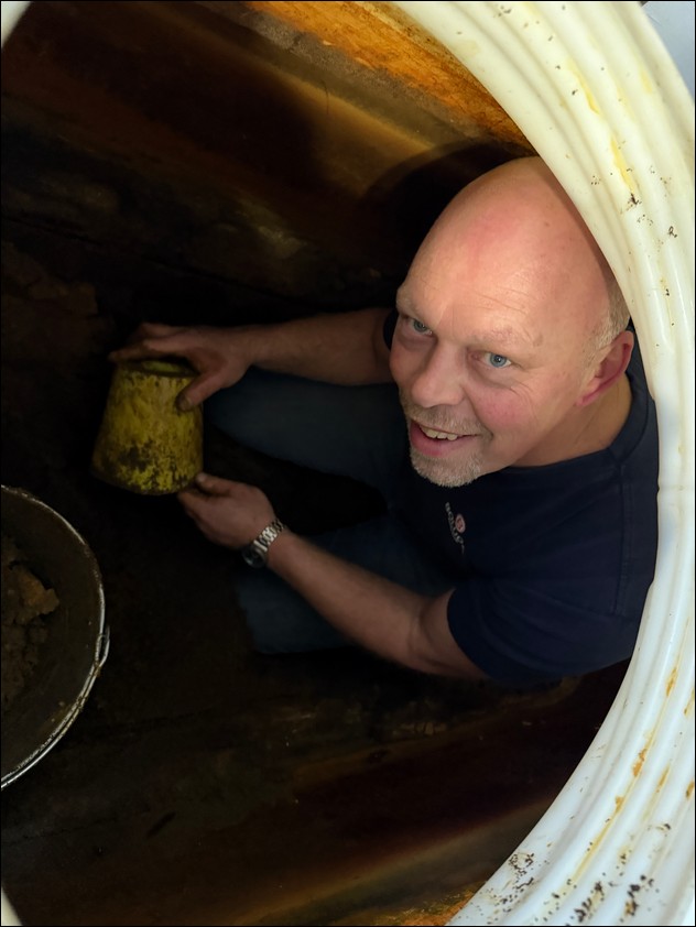 Maandag 27 oktober; In de dagelijkse verslagen zit niet zoveel variatie omdat de deelnemers aan het werkbezoek veel karweien te klaren hadden op het terrein van en in Rehoboth. Al rond zes uur in de ochtend werden de werkpakken aangetrokken. Zaterdag moest het ruimen van de coniferen worden gestopt, maar vandaag kon hier weer aan verder worden gegaan. De monsterklus van deze dag was echter het schoonmaken van de waterzuiveringsinstallatie. Het meer dan 1000 liter metende vat waar het opgepompte water de eerste zuivering ondergaat, diende verwijderd te worden, waarvoor al het zand en de grind uit het vat moest worden geschept. Hiervoor moest Krijn afdalen in het gat van de tank en met een emmer het zand eruit scheppen. Onderwijl zorgde Michel ervoor dat het elektra van de pomp en het buizenstelstel gedemonteerd werd. Toen het vat naar buiten was gedragen moest het van binnen helemaal worden schoongemaakt met hoge druk, schuursponsjes en wasmiddel. Dit kostte Krijn vele uren. Het grind moest worden schoongespoeld zodat het later met het nieuwe zand weer in de tank kon worden gedaan. Dit alles vergde heel veel tijd. Maar halverwege de avond kon er weer gedoucht worden. Als alles goed verloopt kan het systeem er weer minstens een jaar of vijf tegenaan.